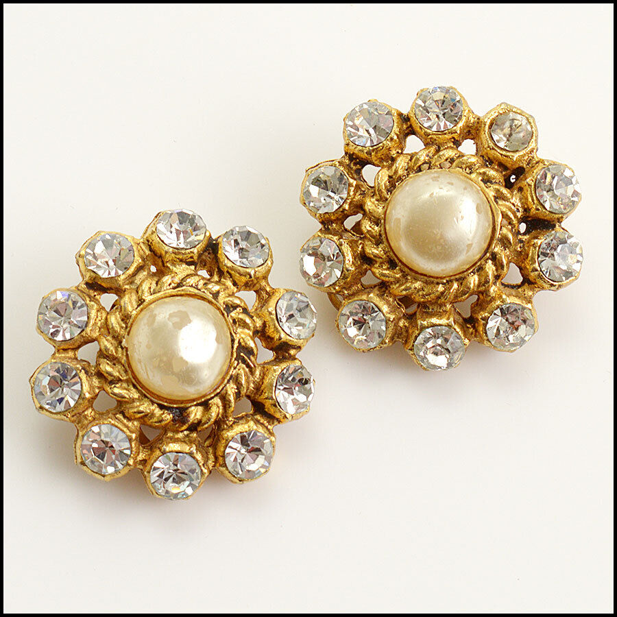 RDC12420 Authentic CHANEL Vintage Rhinestones Pearl Button Clip-On Earrings