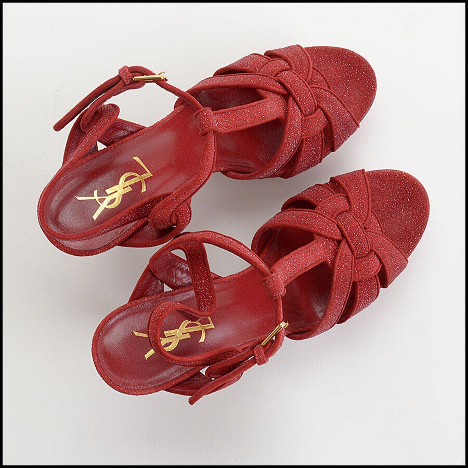 RDC13379 Authentic YSL Red Sparkle Suede Cynoo T-Strap High Heel Sandals Size 38