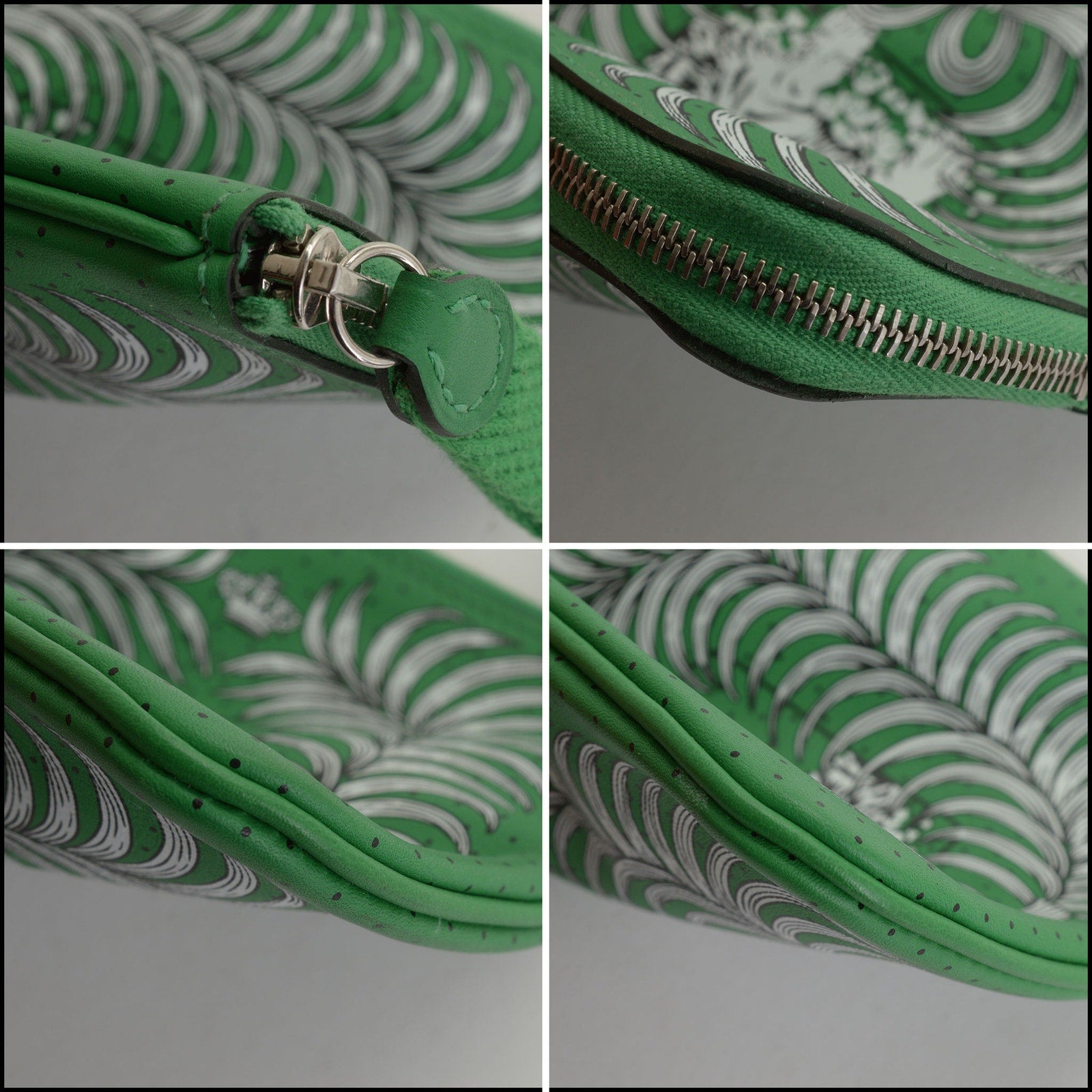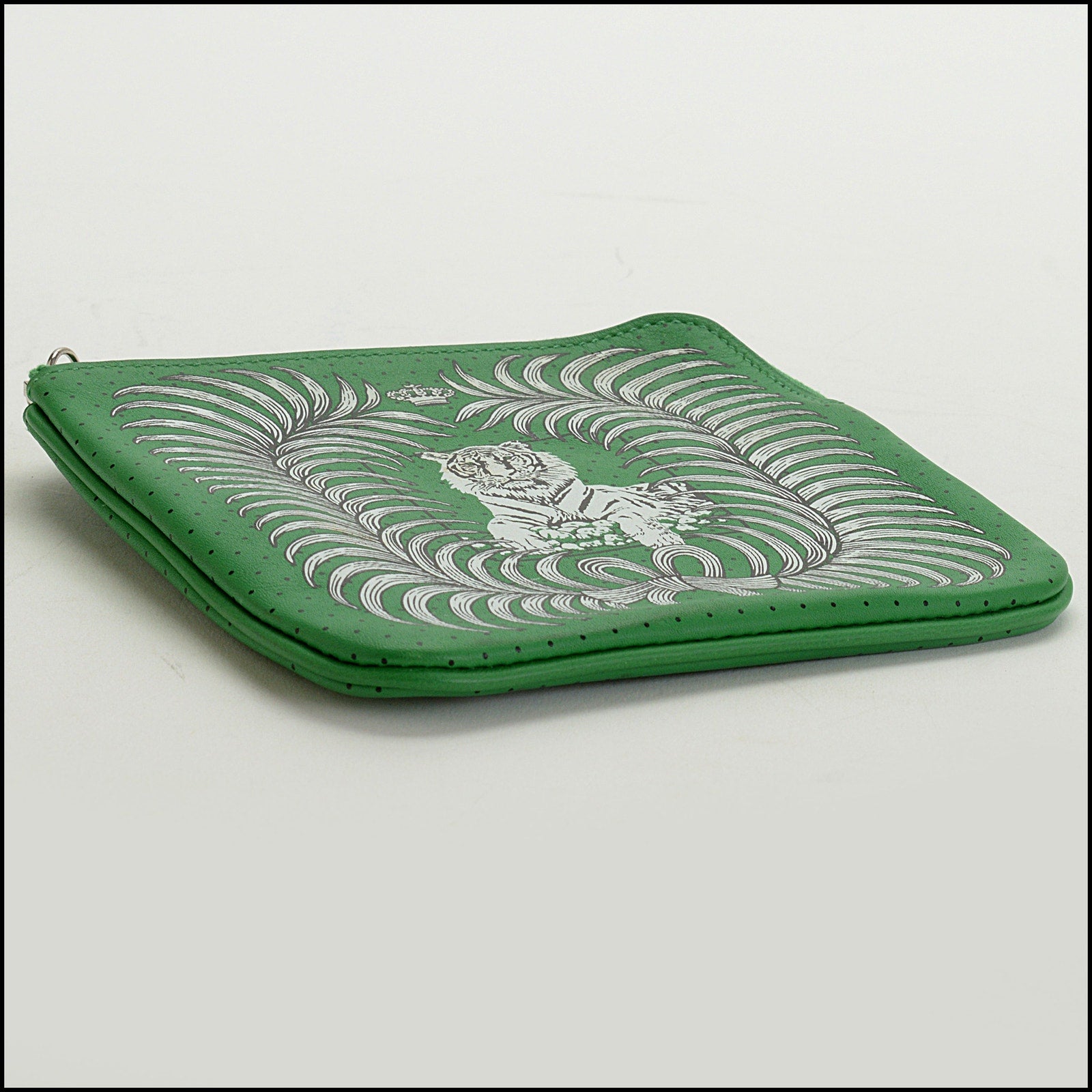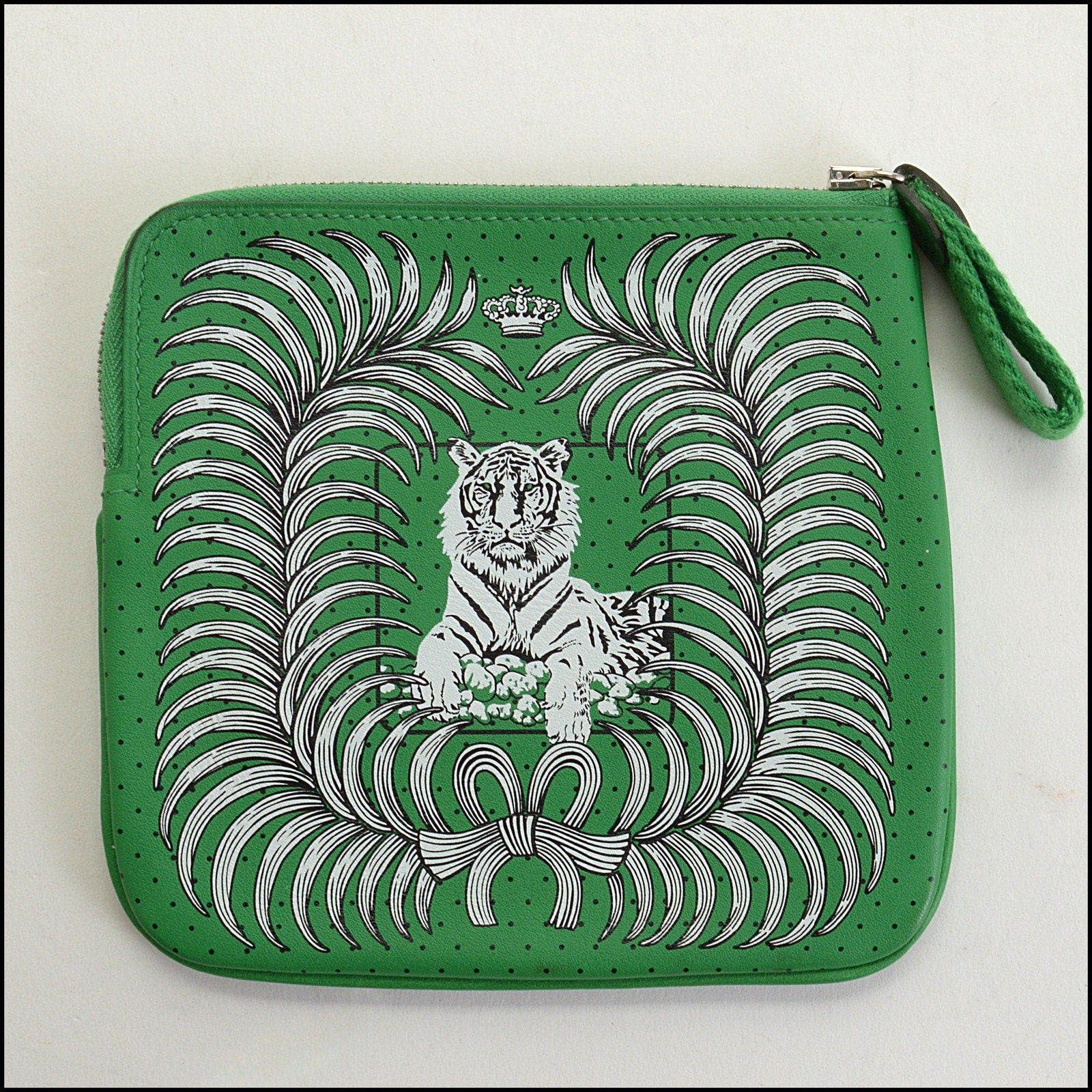 • Features: "Hermes Paris" branding, kelly green/white/black, green leather lining, tiger, palm fronds, crown, bow, polka dots