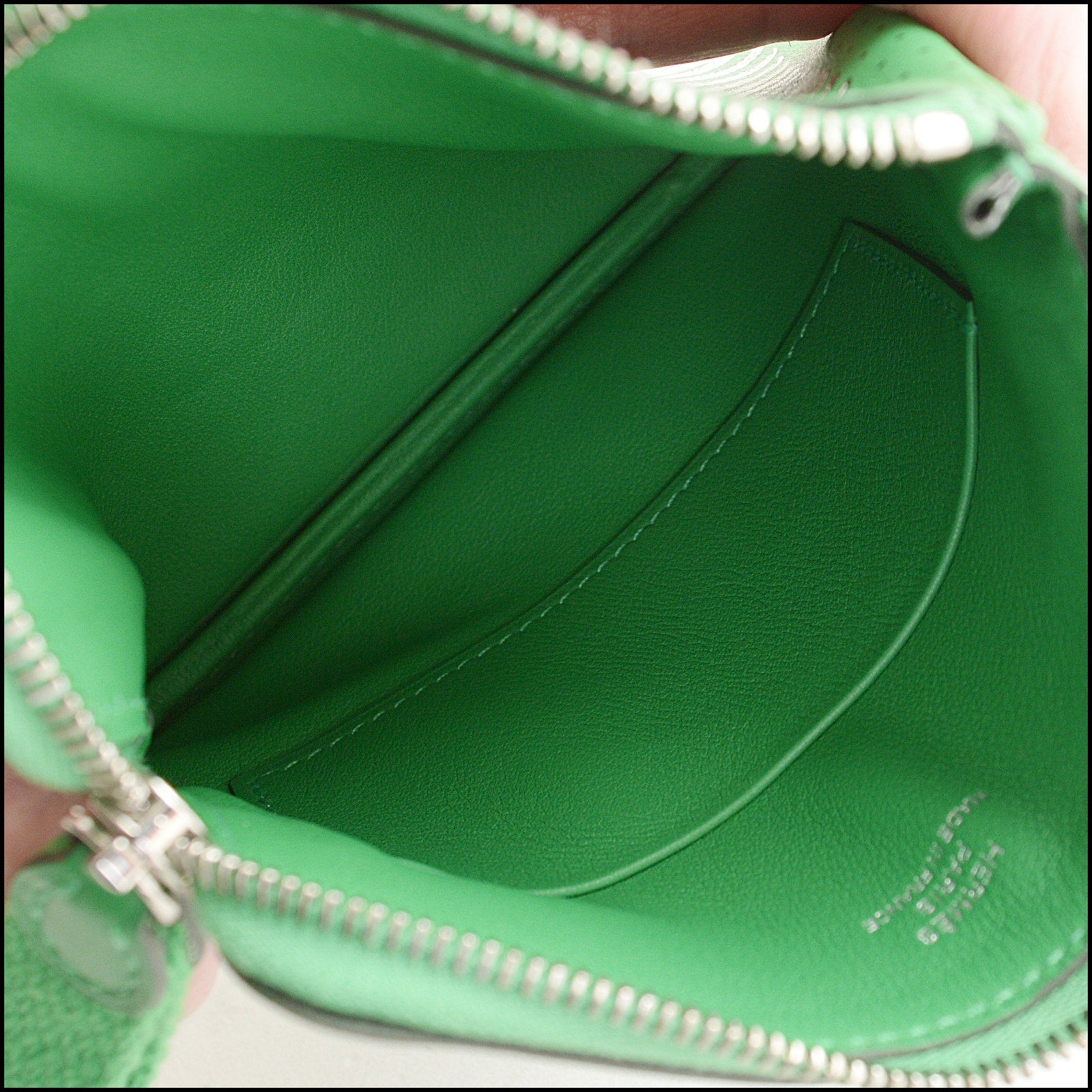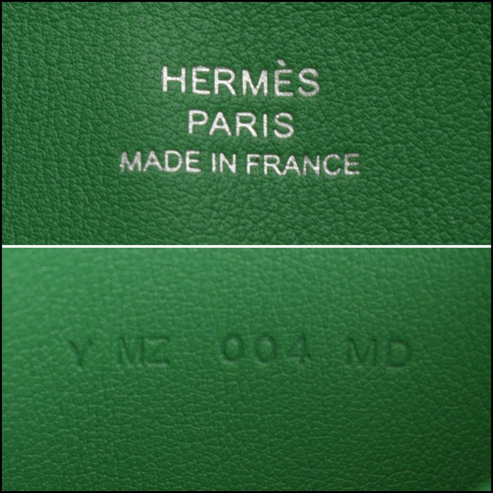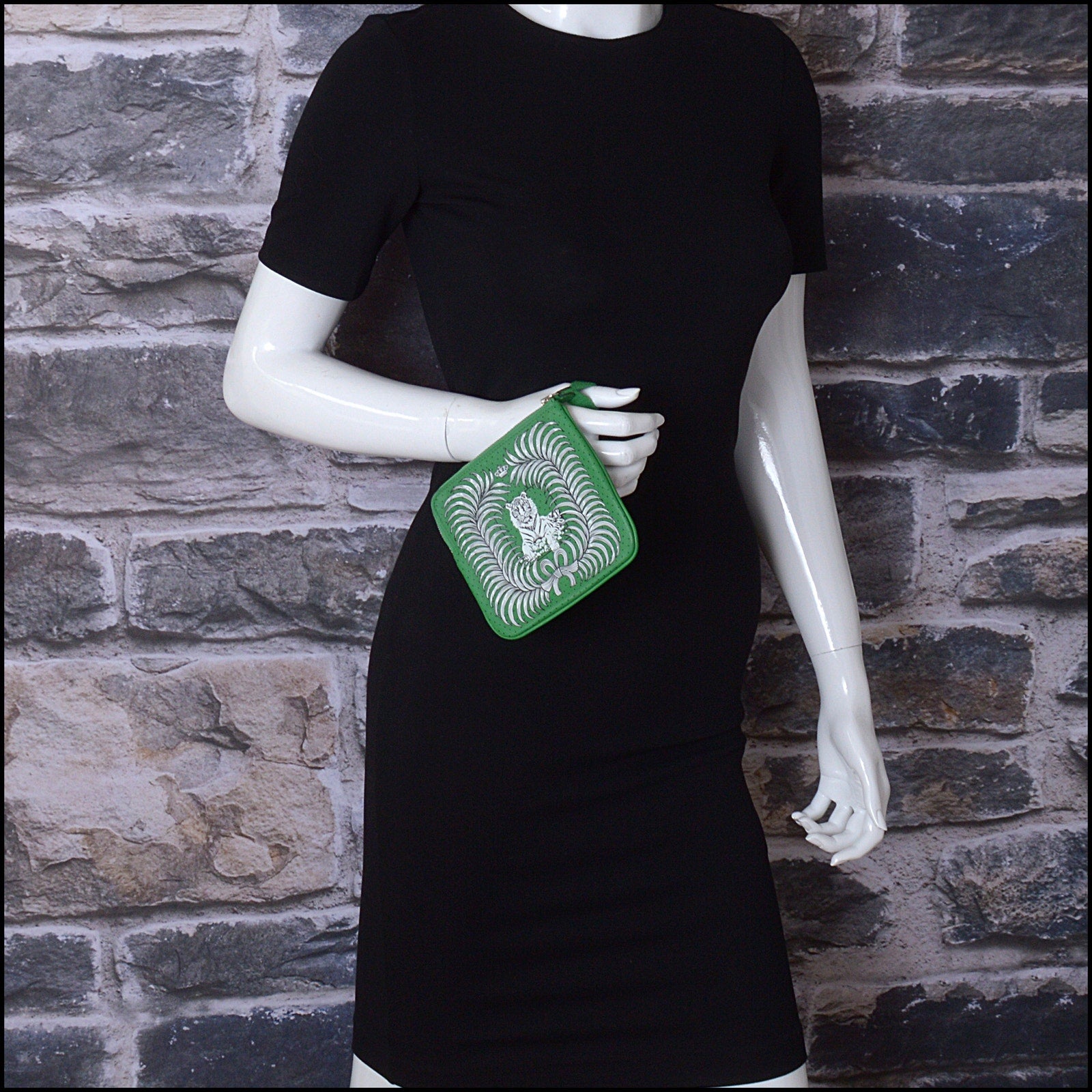 • Features: "Hermes Paris" branding, kelly green/white/black, green leather lining, tiger, palm fronds, crown, bow, polka dots