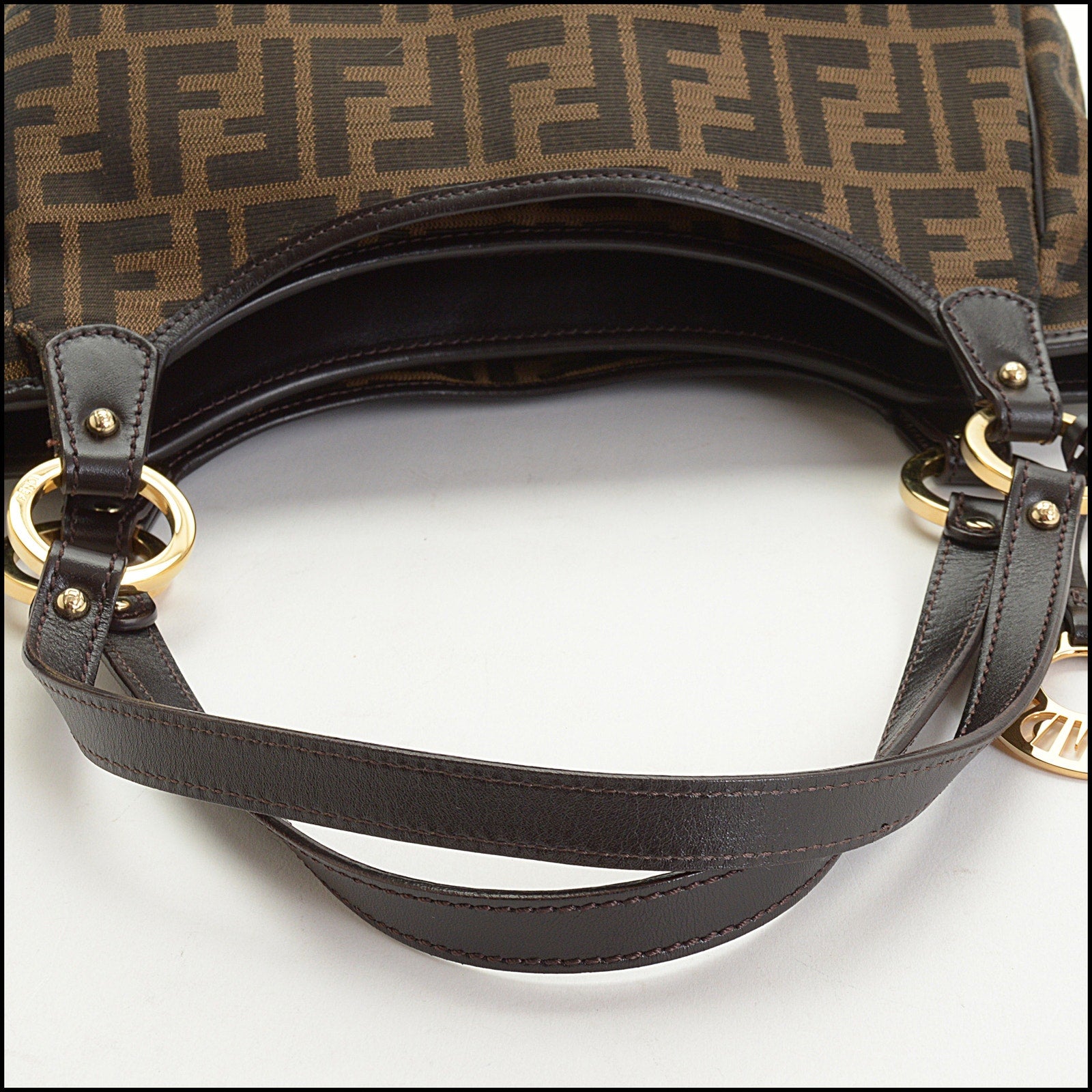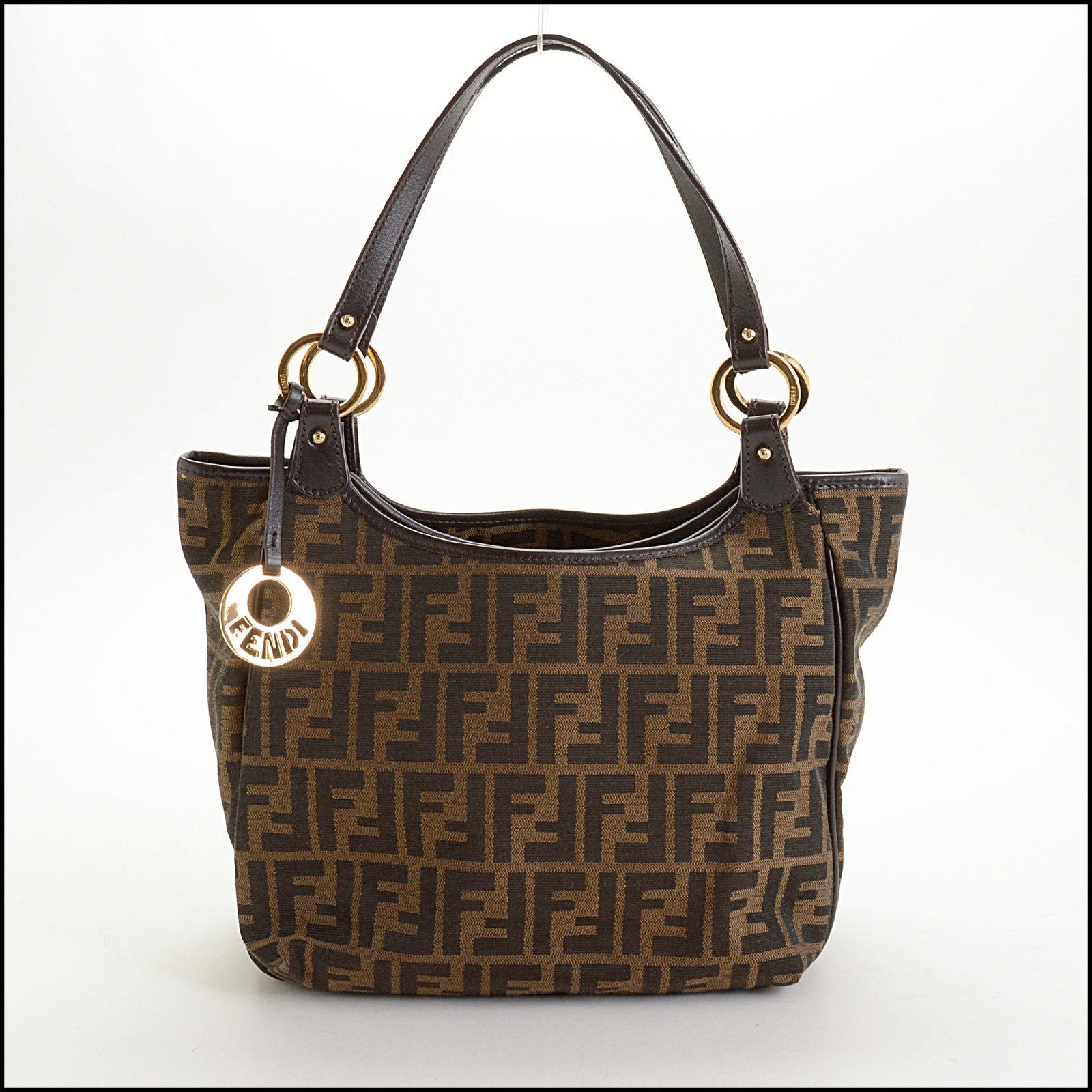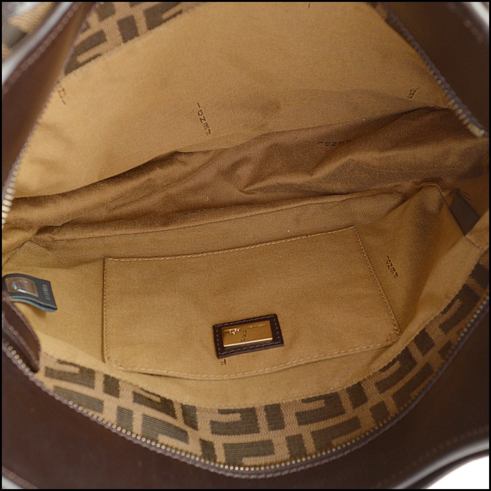 • Features: Fendi logo charm, dark brown leather trim, gold/ochre textile lining