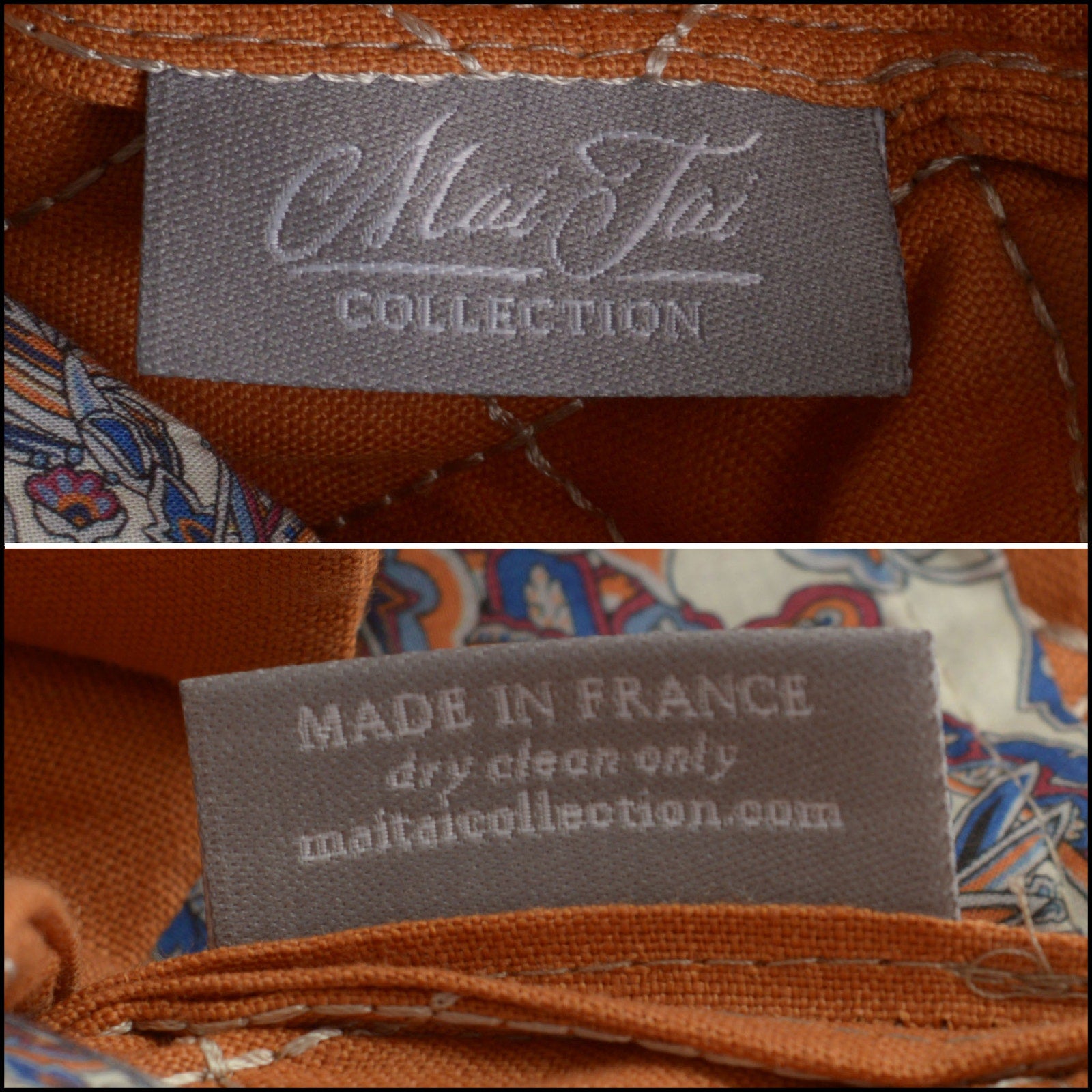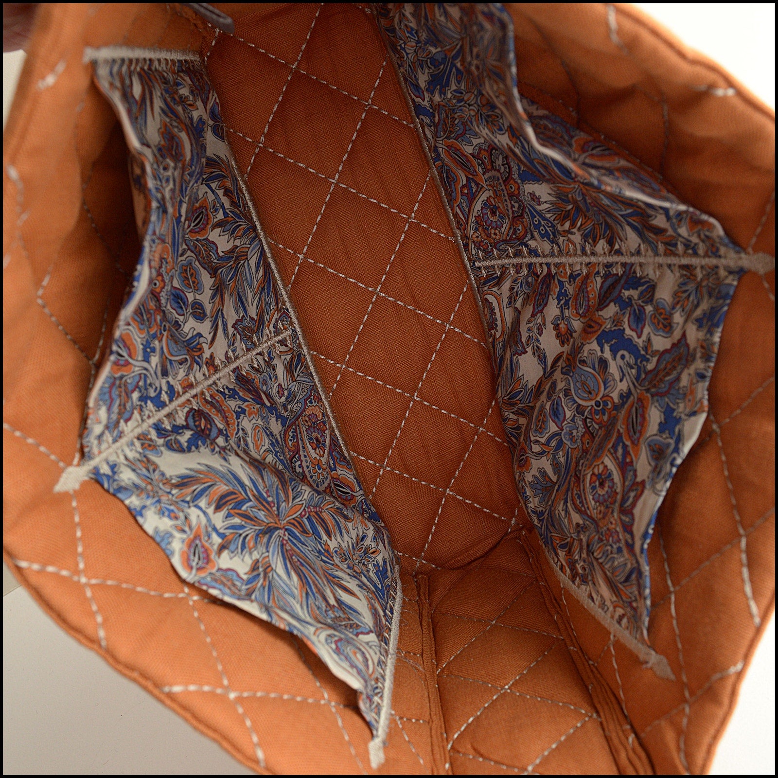 • Features: taupe suede lining, burnt orange linen insert with blue/orange/white floral paisley lining