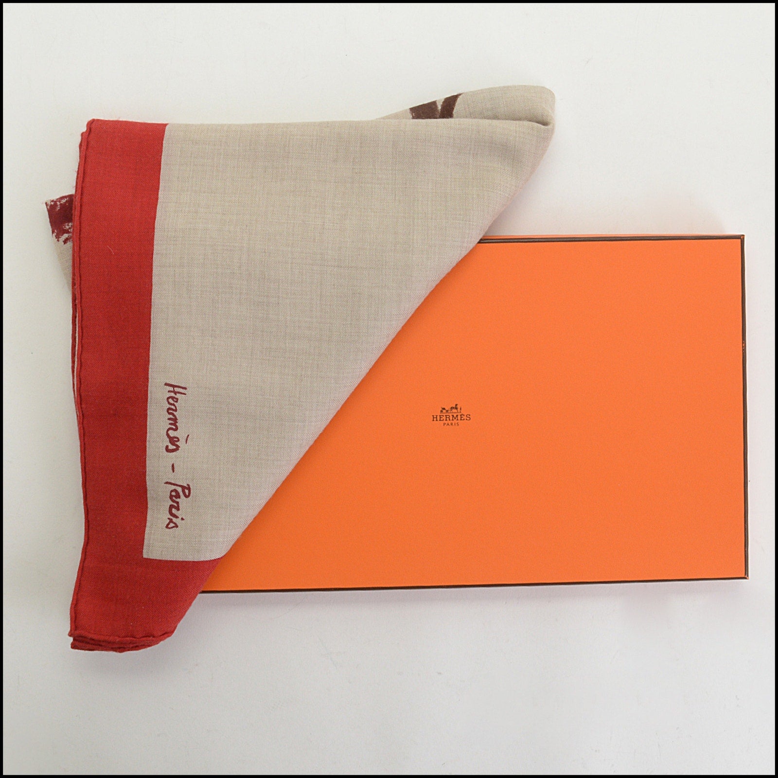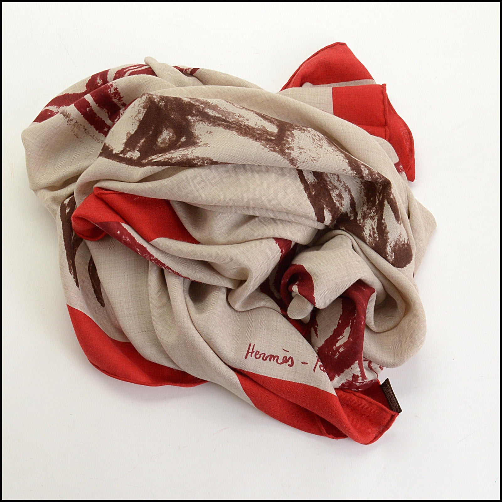 RDC14924 HERMES Natural/Red Cashmere Silk "Chevaux Au Pre" 140 Shawl/Large Scarf