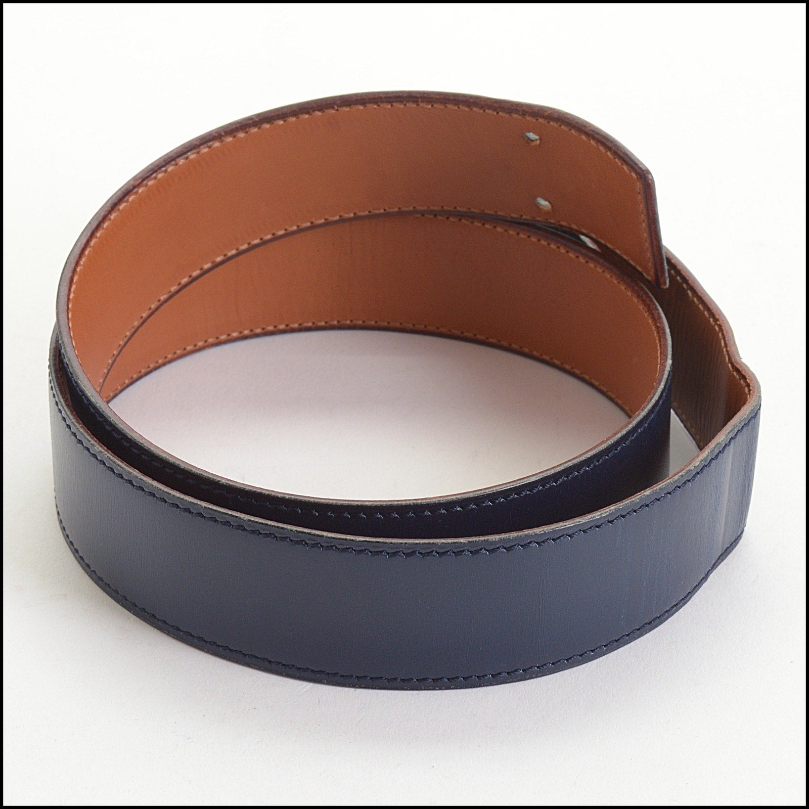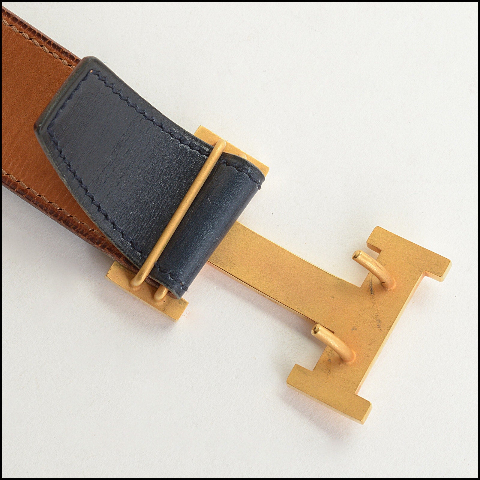RDC14929 HERMES Dark Blue Box Leather Double Prong Gold H Buckle Constance Belt Size S 80/32