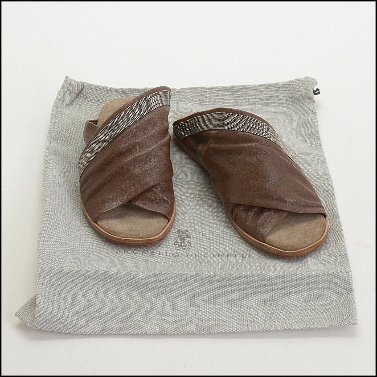 RDC14960 Authentic BRUNELLO CUCINELLI Brown Leather Monili Beaded Accent Slides Size 39