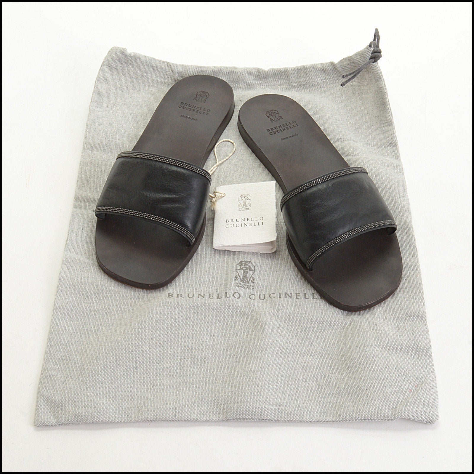 RDC14961 Authentic BRUNELLO CUCINELLI Black Leather Monili-Embellished Slides Size 38