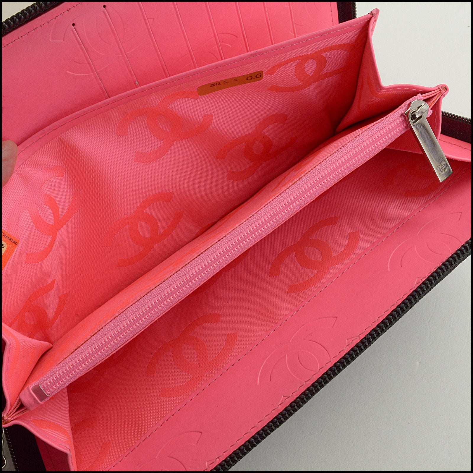 • Features: logo chain pull, hot pink leather lining